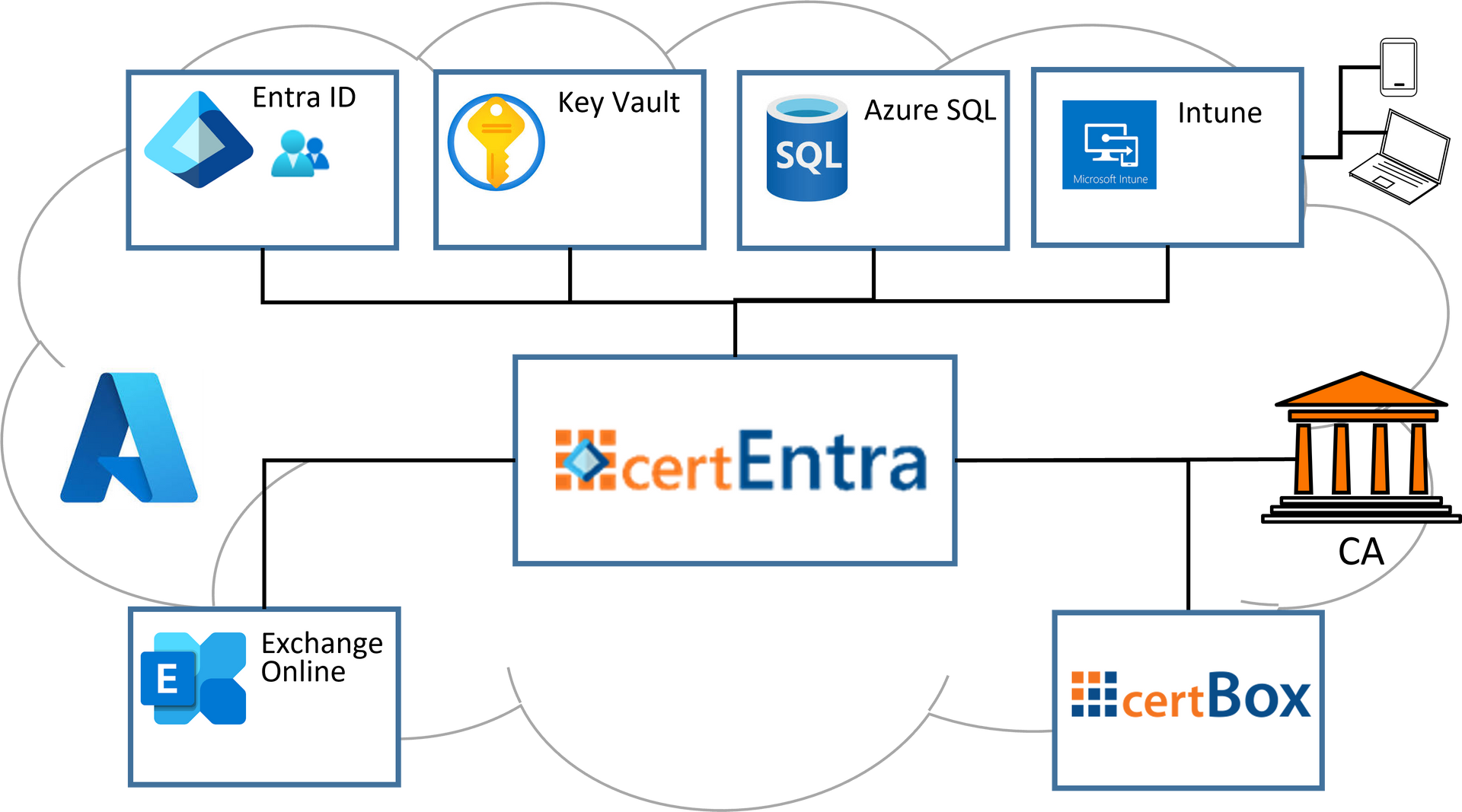 certEntra läuft auf einer virtuellen Maschine in der Azure-Cloud des Kunden oder auch vor Ort und unterliegt somit vollständig seiner eigenen Kontrolle. Für die erforderlichen Anmeldeinformationen und Schlüssel wird ein kundeneigener Azure Key Vault verwendet. Die Zertifikate und archivierten privaten Schlüssel werden in einer selbst gehosteten oder vorzugsweise verwalteten SQL-Datenbank wie Microsoft Azure SQL gespeichert. Die certEntra-Web-App ist für autorisierte Entra-ID-Benutzer mit rollenbasierten Berechtigungen zugänglich. Für die Registrierung von Zertifikaten einer öffentlichen Zertifizierungsstelle (CA) wie SwissSign, GlobalSign oder Digicert ist ein entsprechender Vertrag für domänenvalidierte oder organisationsvalidierte Zertifikate erforderlich. Die API-Anmeldeinformationen der Zertifizierungsstelle werden von certEntra für die Verbindung verwendet.