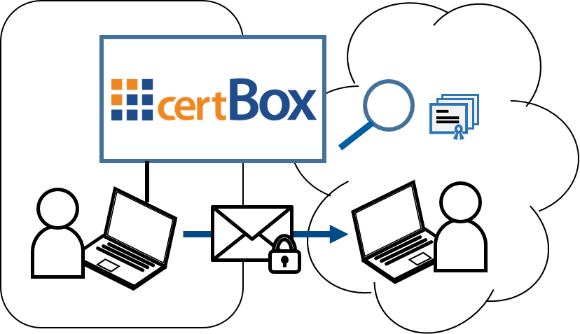 Bei der ausgehenden Verschlüsselung erfolgt die Suche nach externen digitalen Zertifikaten durch Outlook und andere Clientanwendungen automatisch über LDAP. Ein Benutzer kann Zertifikate auch manuell über einen HTML-Browser herunterladen. Die certBox bietet durch ihre integrierte PKI-Verzeichnisdatenbank ein hohes Maß an PKI-Interoperabilität. Damit können Millionen von Benutzerverschlüsselungszertifikaten vom Certificate Broker gefunden werden. Partner, die kein eigenes LDAP-Verzeichnis bereitstellen, können ihre Zertifikate in Ihre certBox hochladen. Mit Ad-hoc-Zertifikaten von certBox ICE ist eine Ende-zu-Ende-Verschlüsselung auch für Empfänger möglich, die kein X.509-Zertifikat besitzen. Der interne Benutzer kann wie gewohnt an jeden oder sogar an eine Domain-Adresse auf der Whitelist verschlüsseln.