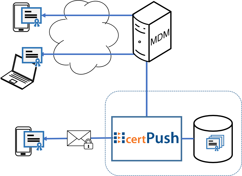 certPush MDM lädt das Zertifikat und den privaten Schlüssel eines Benutzers in sein konfiguriertes Profil im Mobile Device Management (MDM)-System hoch. Dies erfolgt über einen sicheren Kanal über die MDM-API. Der PKCS#12-Container und das Passwort können dann in einem E-Mail- oder Exchange-Profil auf das mobile Gerät oder sogar auf MDM-verwaltete Windows-PCs oder Macs übertragen werden.