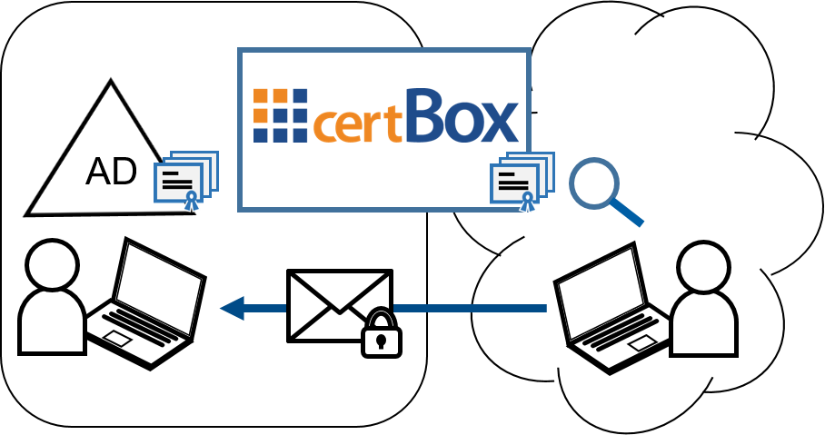 Standard e-mail clients like Outlook or Thunderbird support e-mail encryption based on the S/MIME standard. In order to encrypt for your internal users, external partners require your public certificates. If your internal users want to encrypt, they need the certificates of their external recipients. Instead of letting users exchange their certificates manually this job has to be automated. The Secardeo certBox is a certificate directory service that serves for these two tasks: